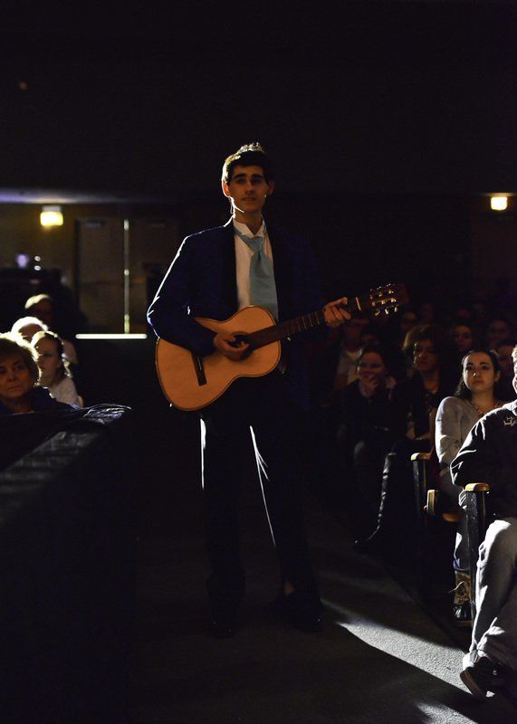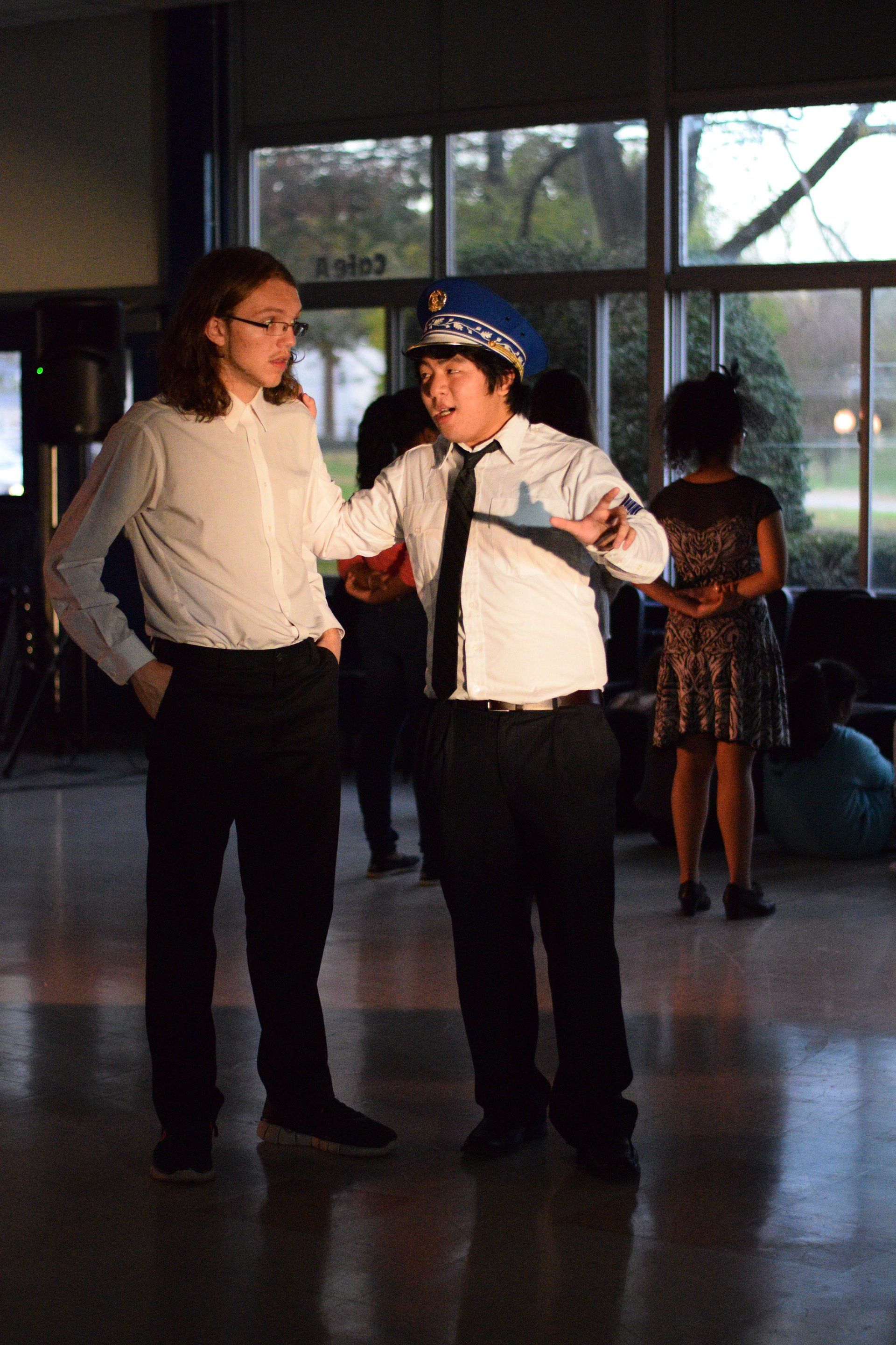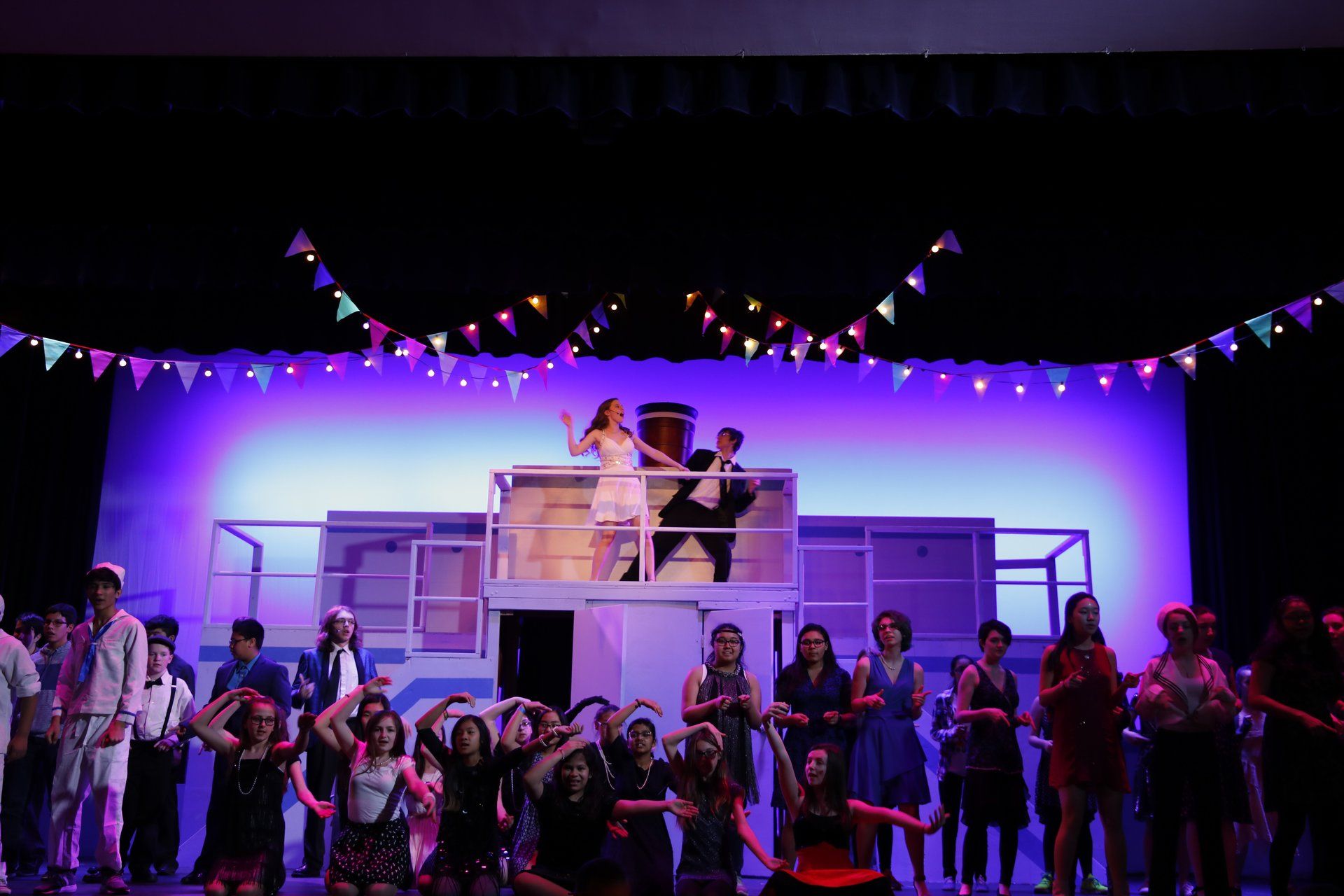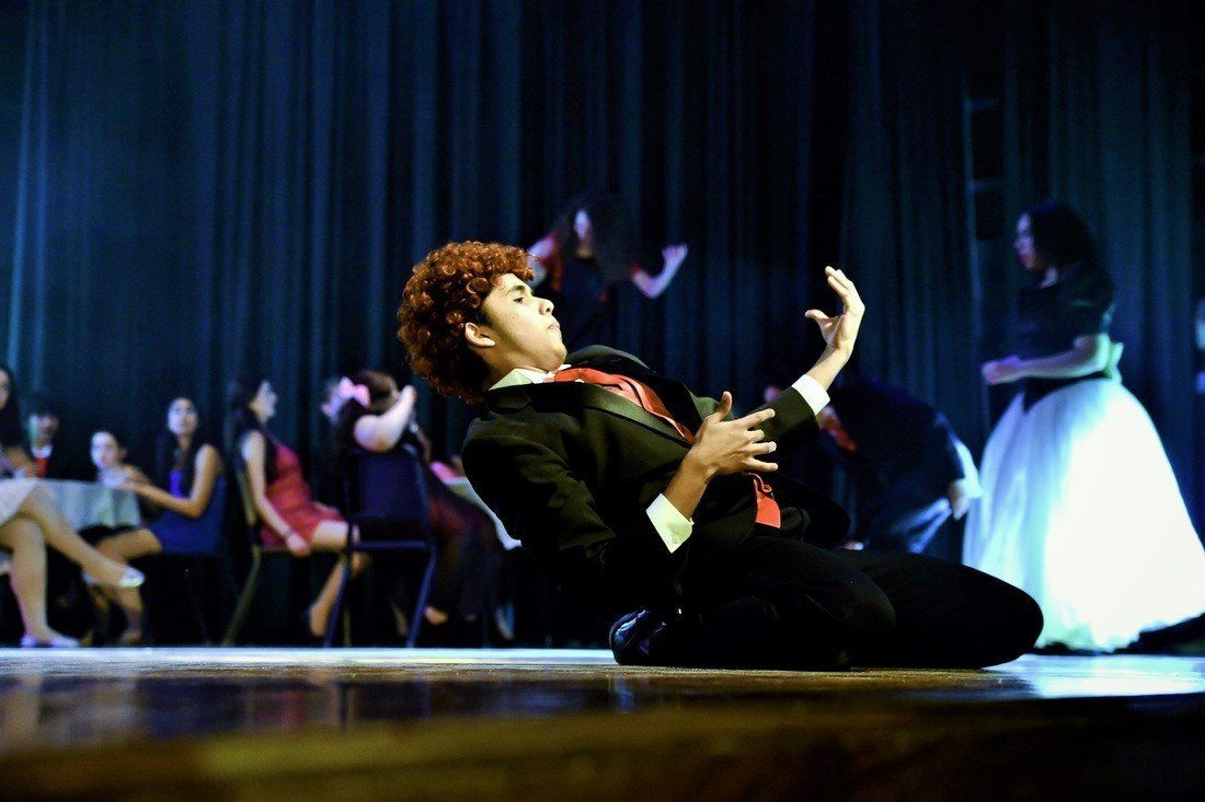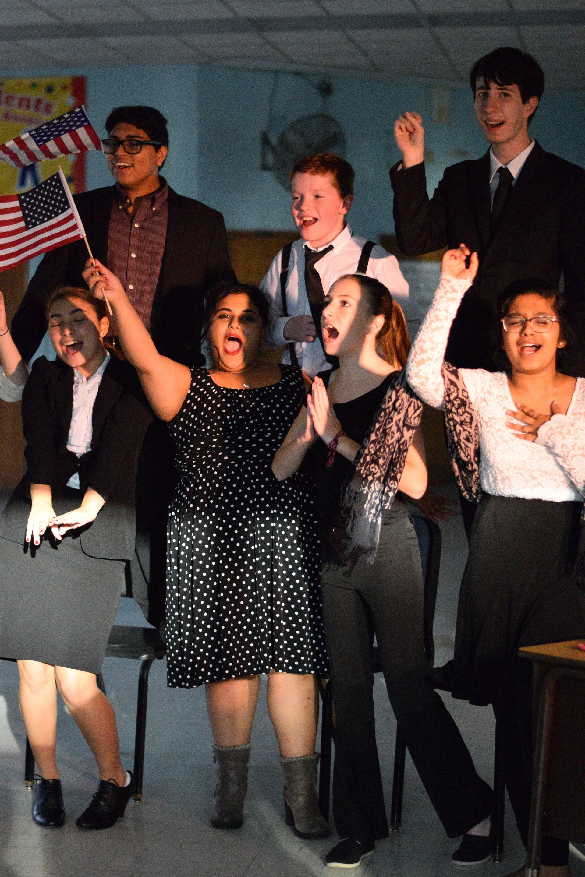 Mark Davenport and Christy Martin's showdown for school president featured tons of live and pre-recorded projections, including a final drone shot that started on stage and ended 500 feet above the school. This was also the first time we paired with the social studies department and brought a preview performance to every class!